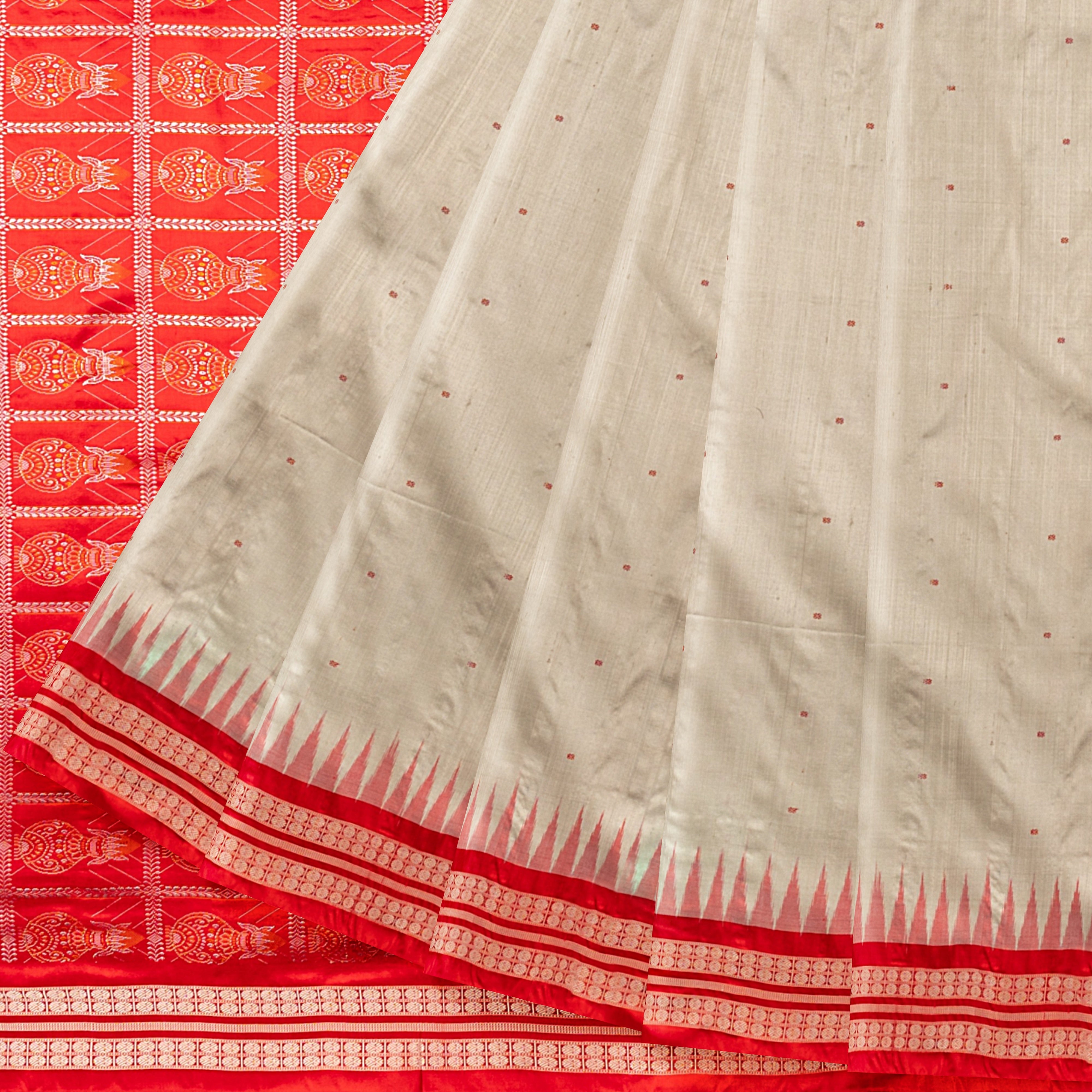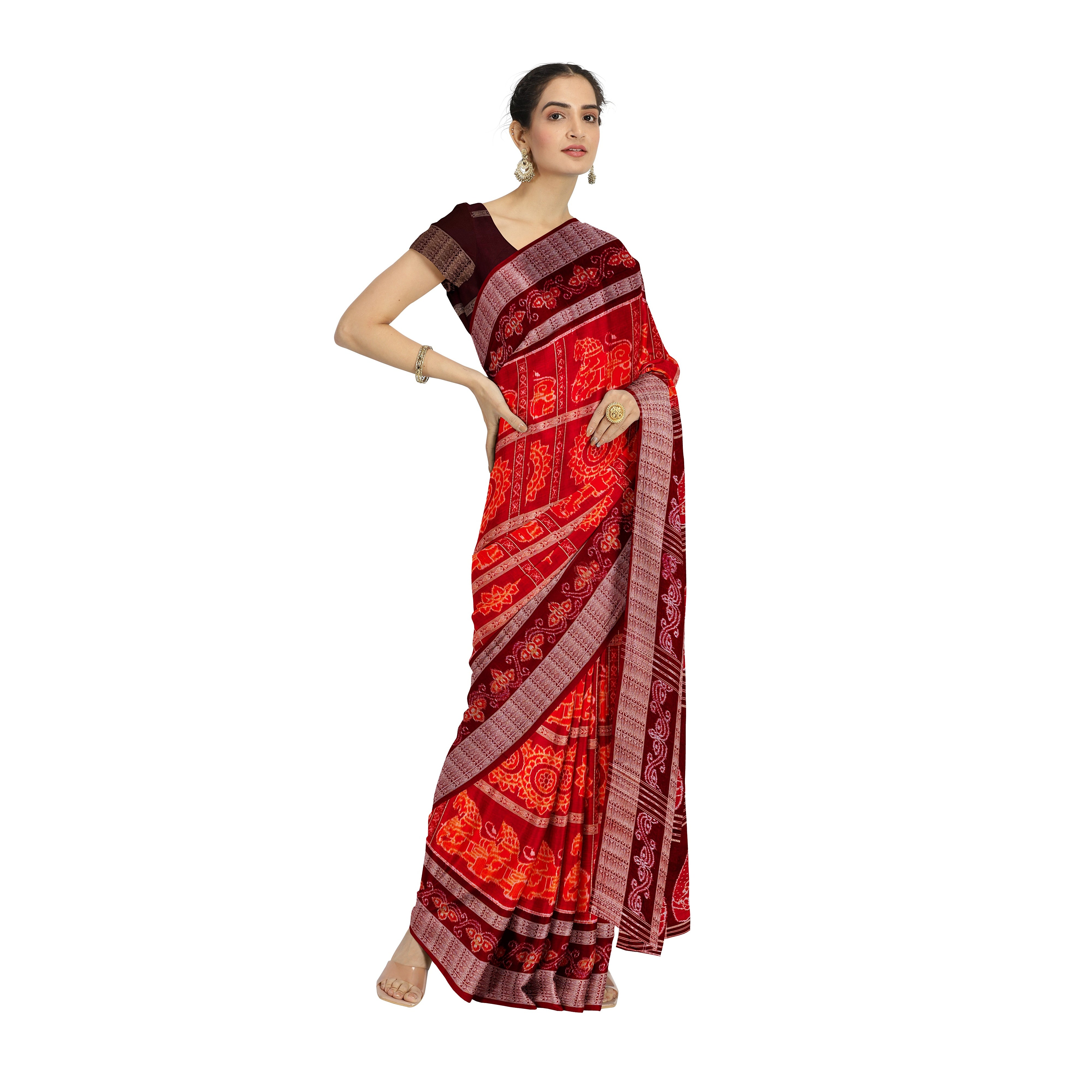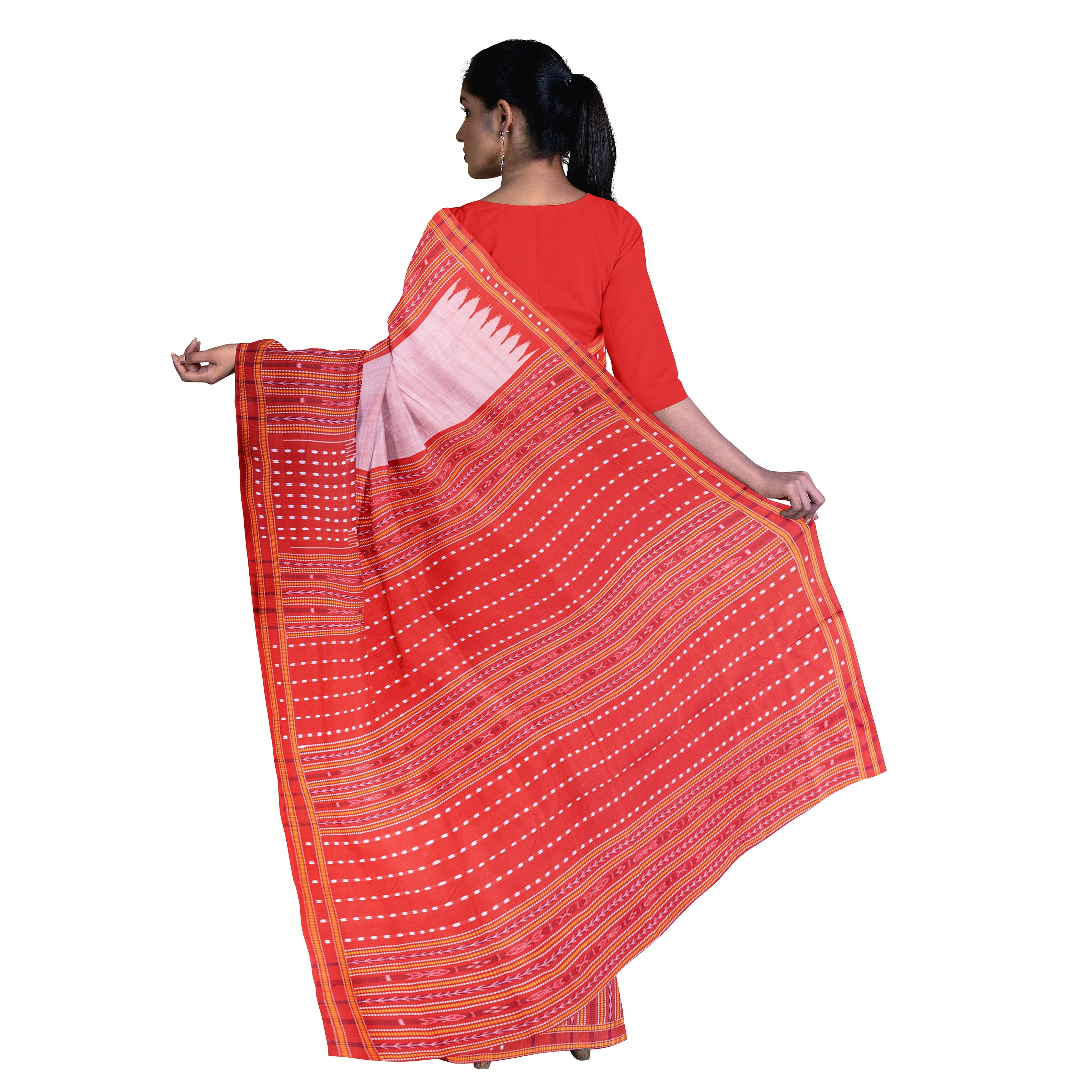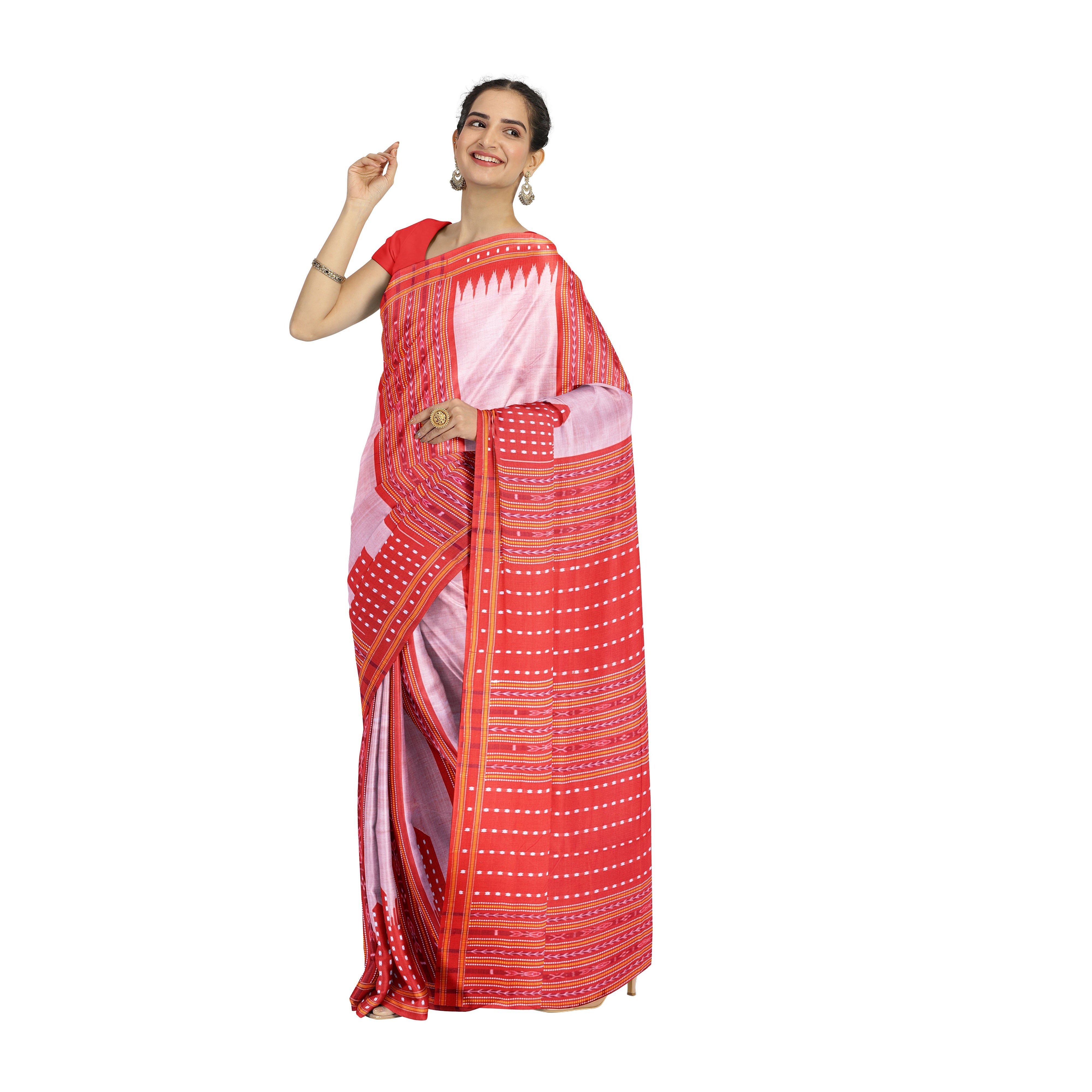 Discover the charm of this Bapta saree, crafted from a comfortable and elegant raw silk and cotton mix. The saree showcases a vibrant red buta design that dances across the fabric, while the pallu and body are further enhanced by classic Sambalpuri traditional motifs. This ensemble is finished with a simple yet sophisticated plain red blouse piece.