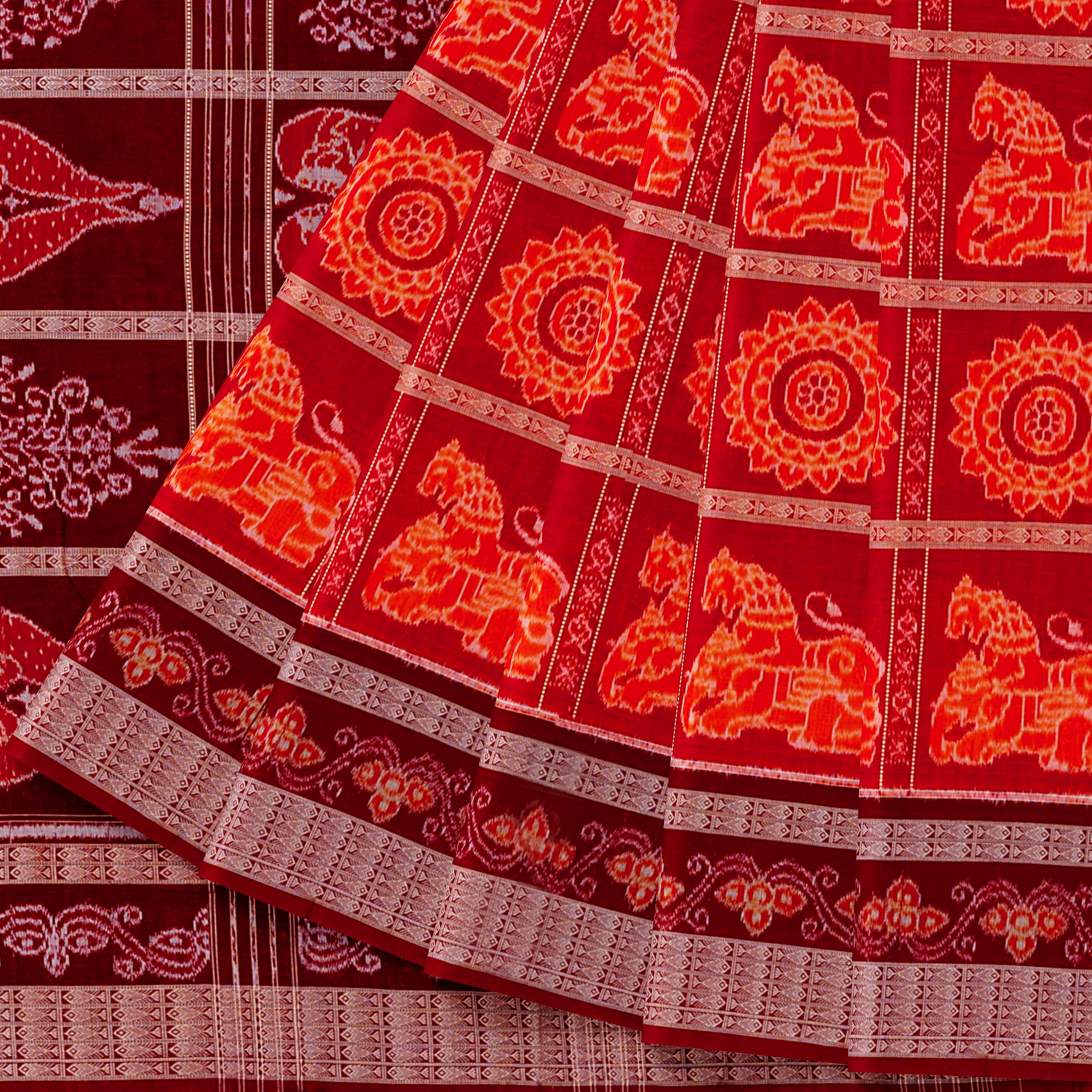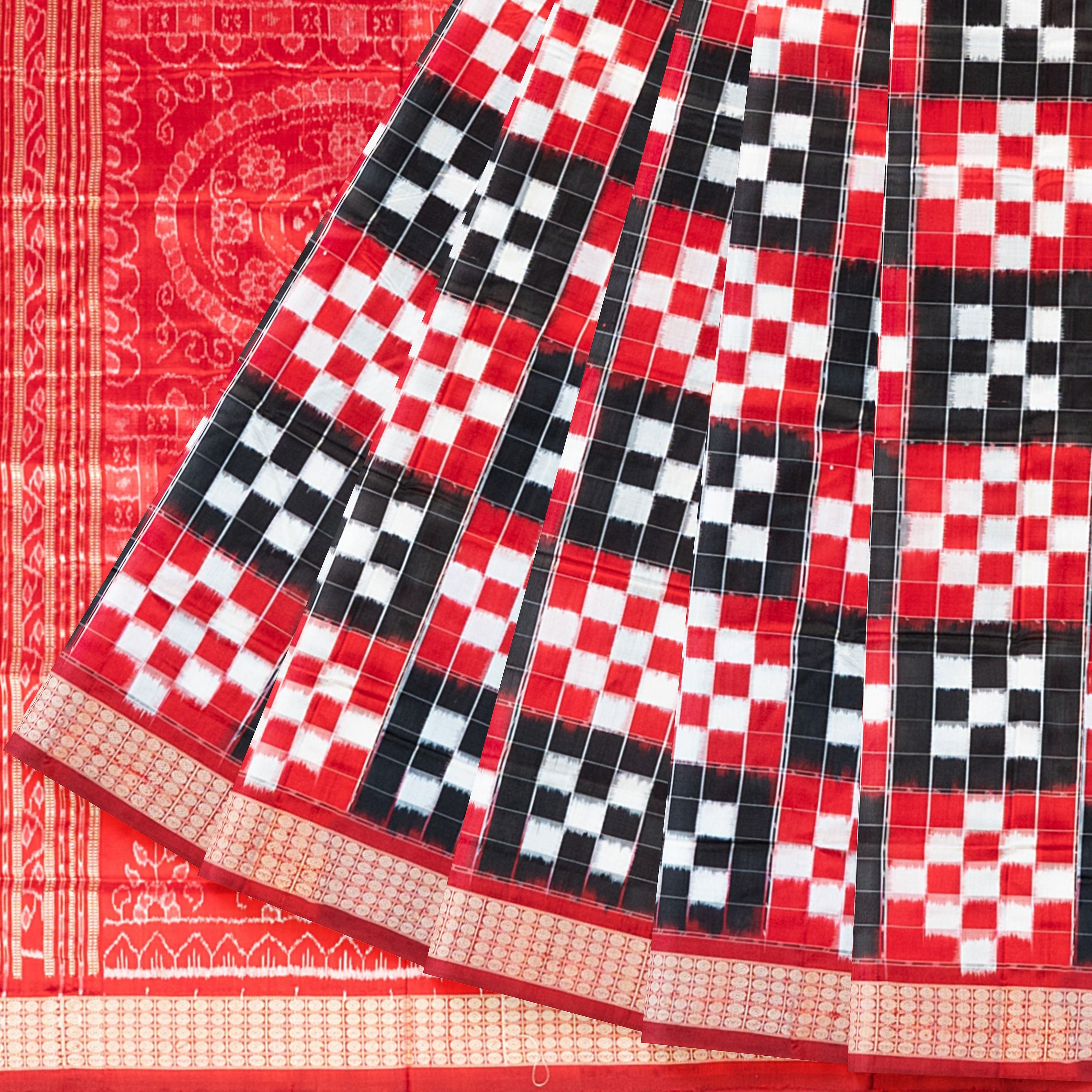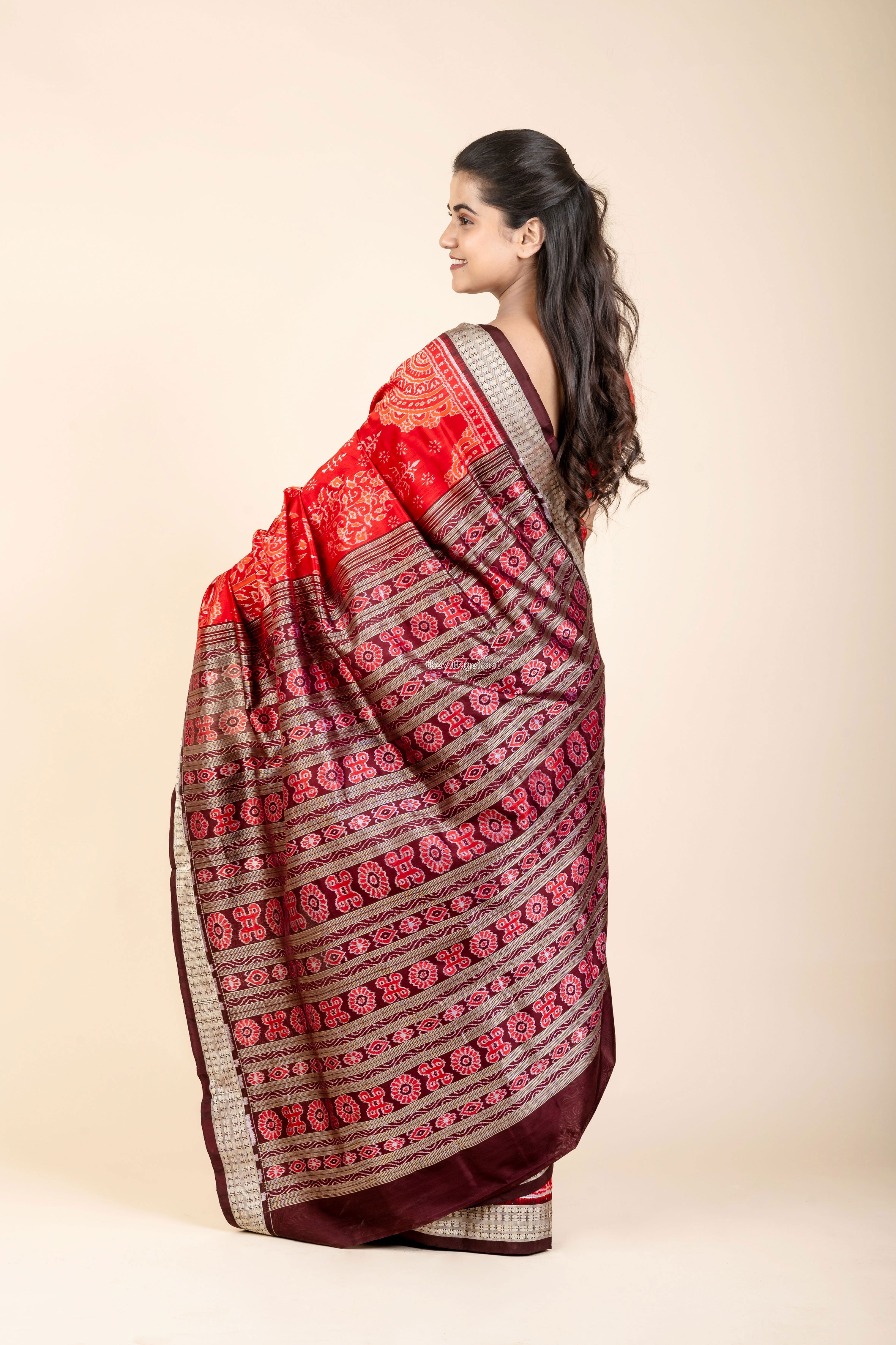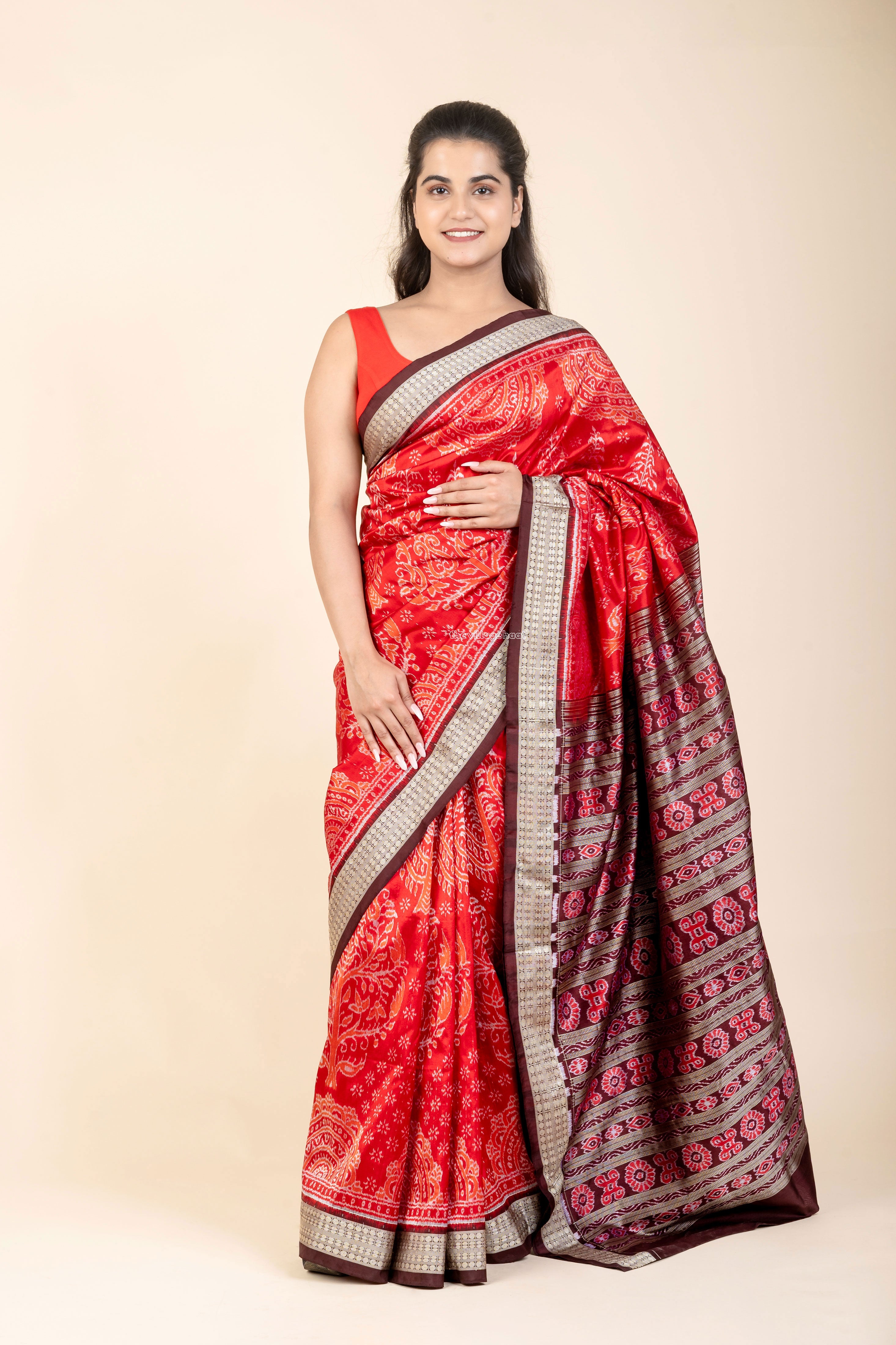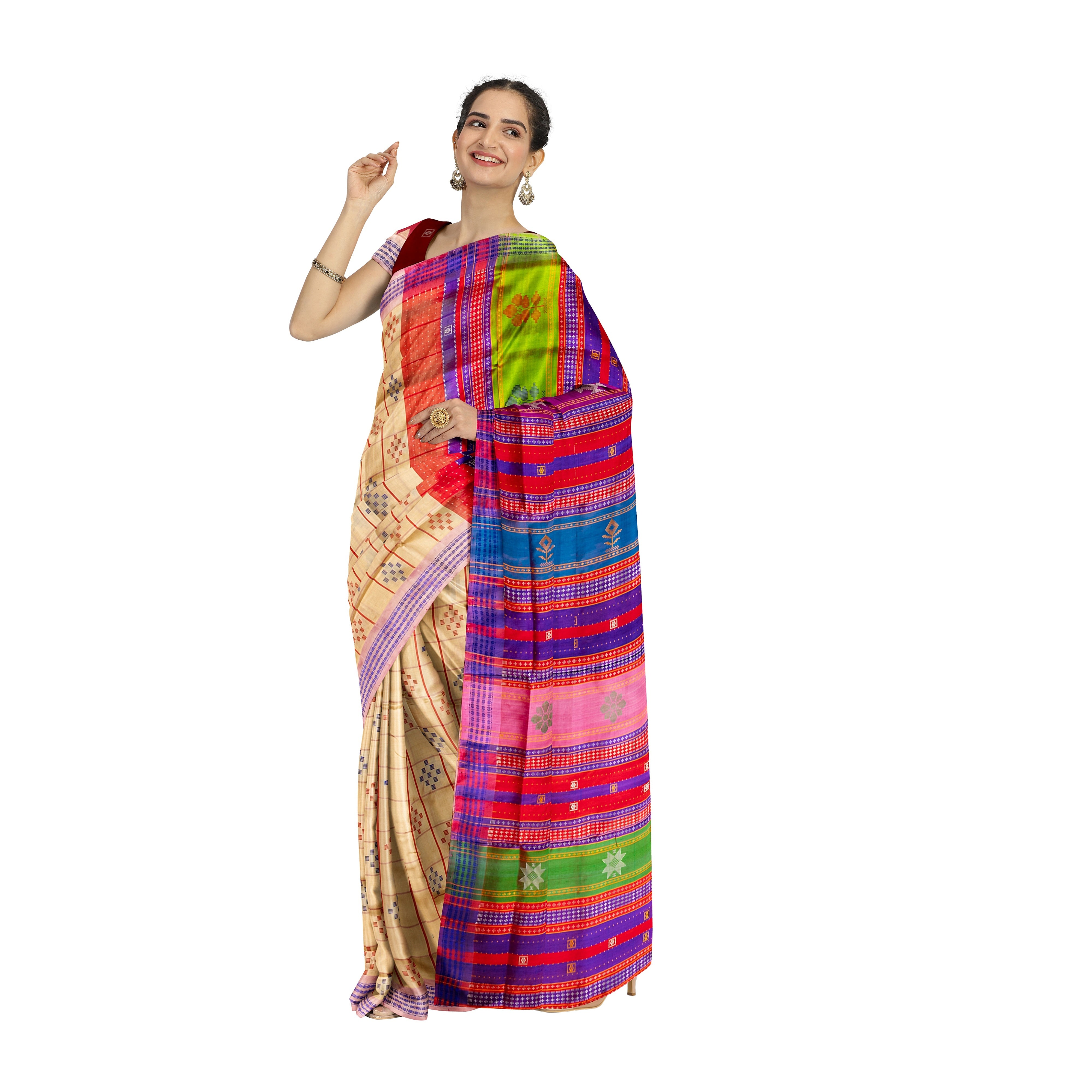 Discover the charm of this Bapta saree, crafted from a comfortable and elegant raw silk and cotton mix. The saree showcases a vibrant red buta design that dances across the fabric, while the pallu and body are further enhanced by classic Sambalpuri traditional motifs. This ensemble is finished with a simple yet sophisticated plain red blouse piece.