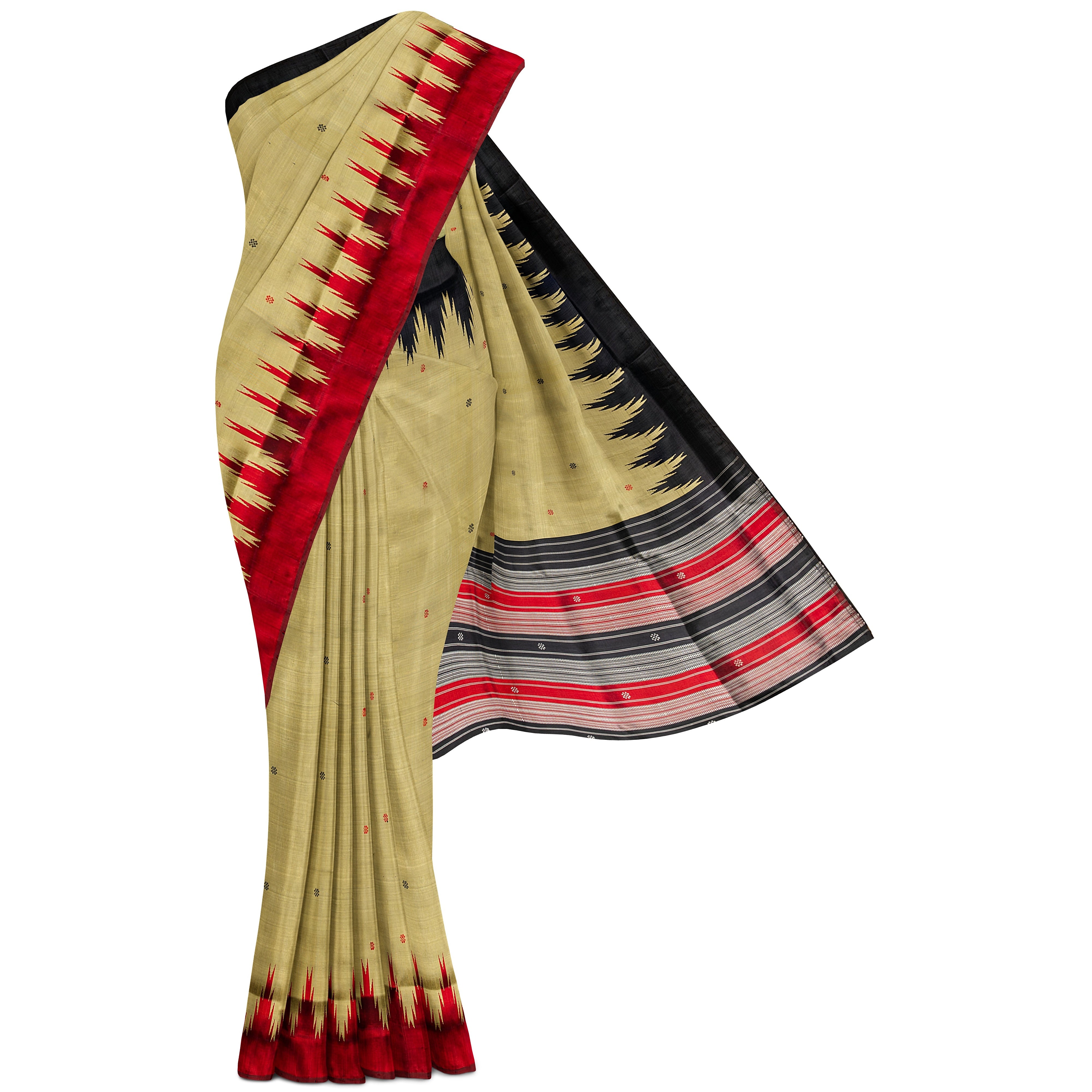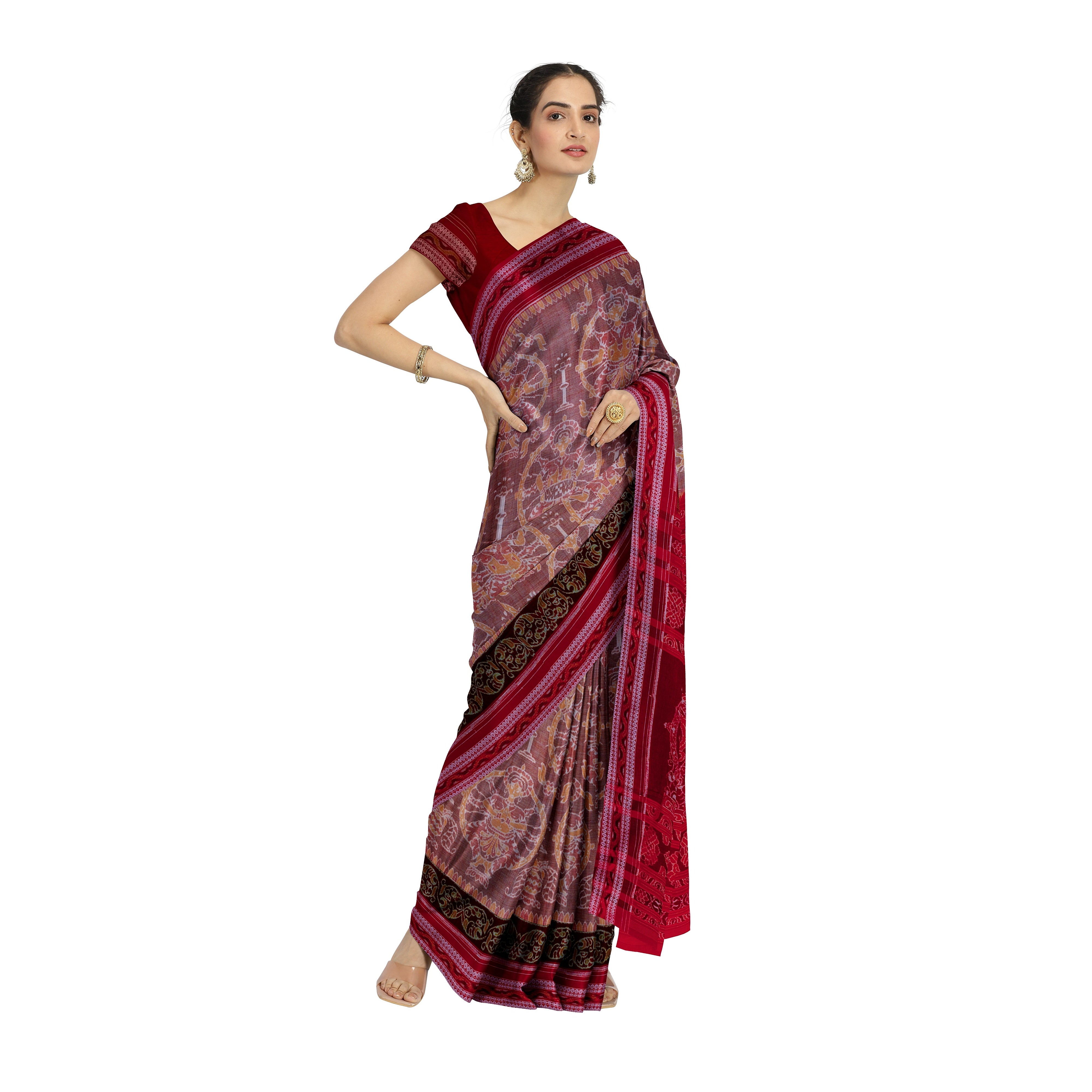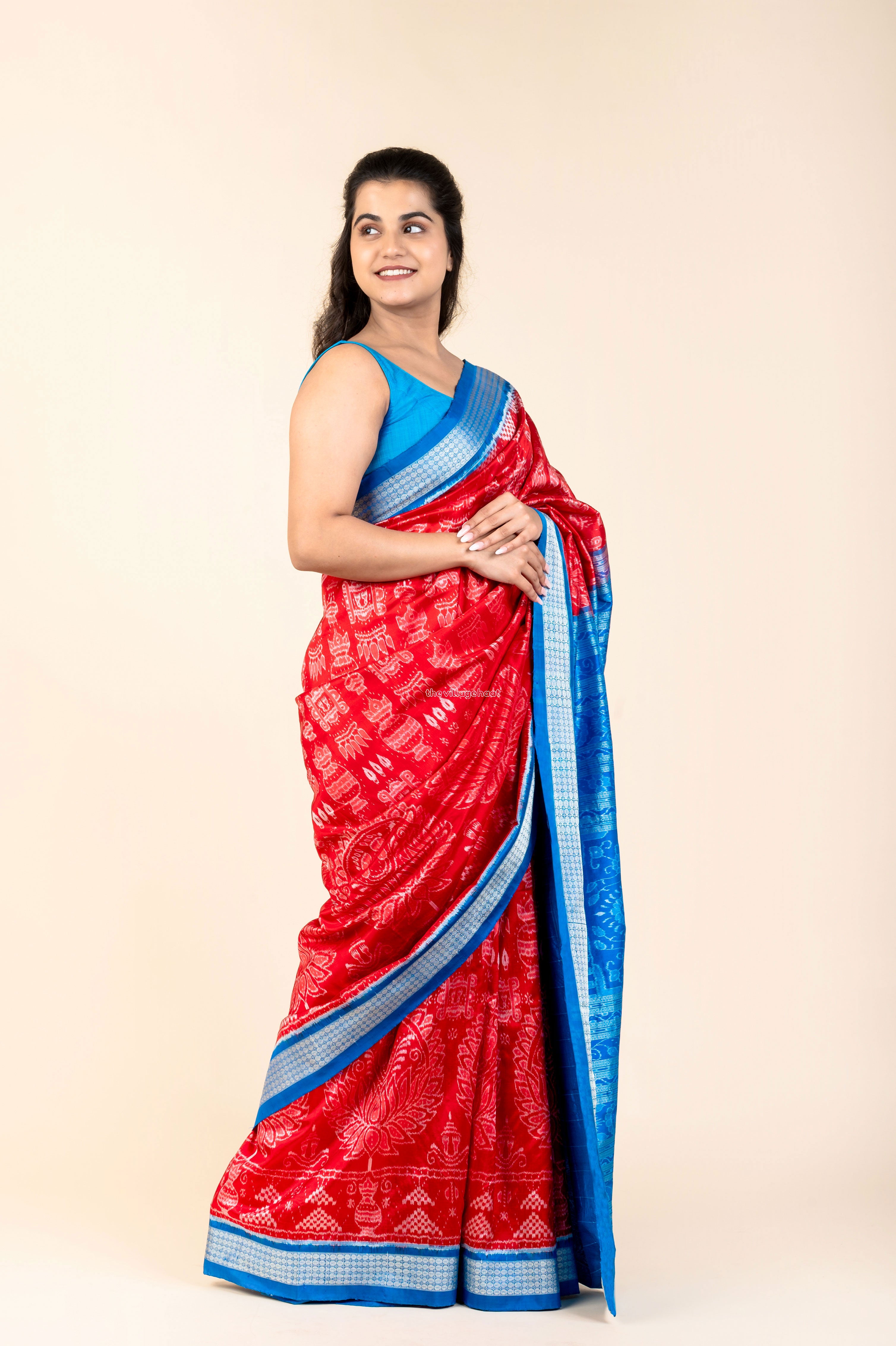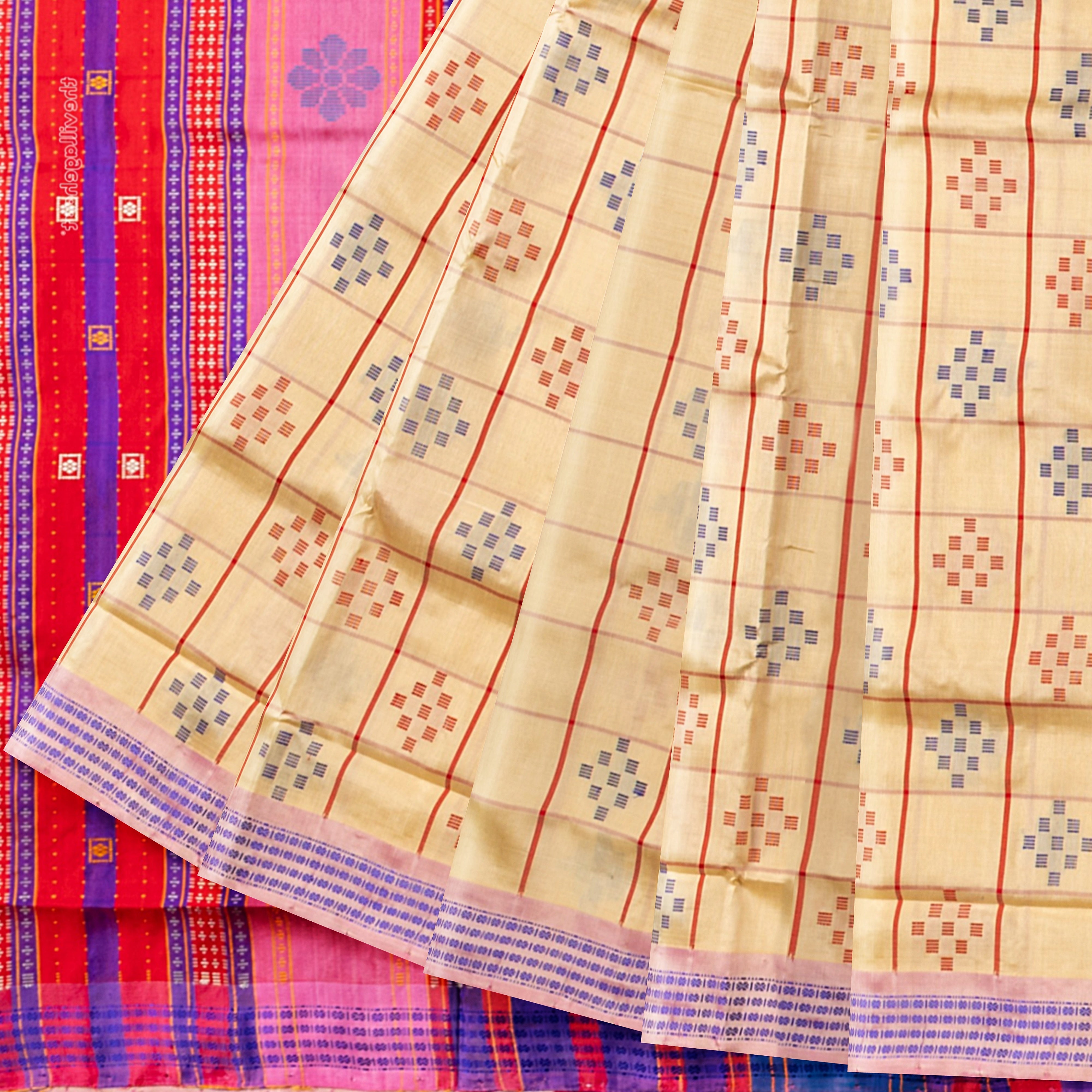 Discover the charm of this Bapta saree, crafted from a comfortable and elegant raw silk and cotton mix. The saree showcases a vibrant red buta design that dances across the fabric, while the pallu and body are further enhanced by classic Sambalpuri traditional motifs. This ensemble is finished with a simple yet sophisticated plain red blouse piece.