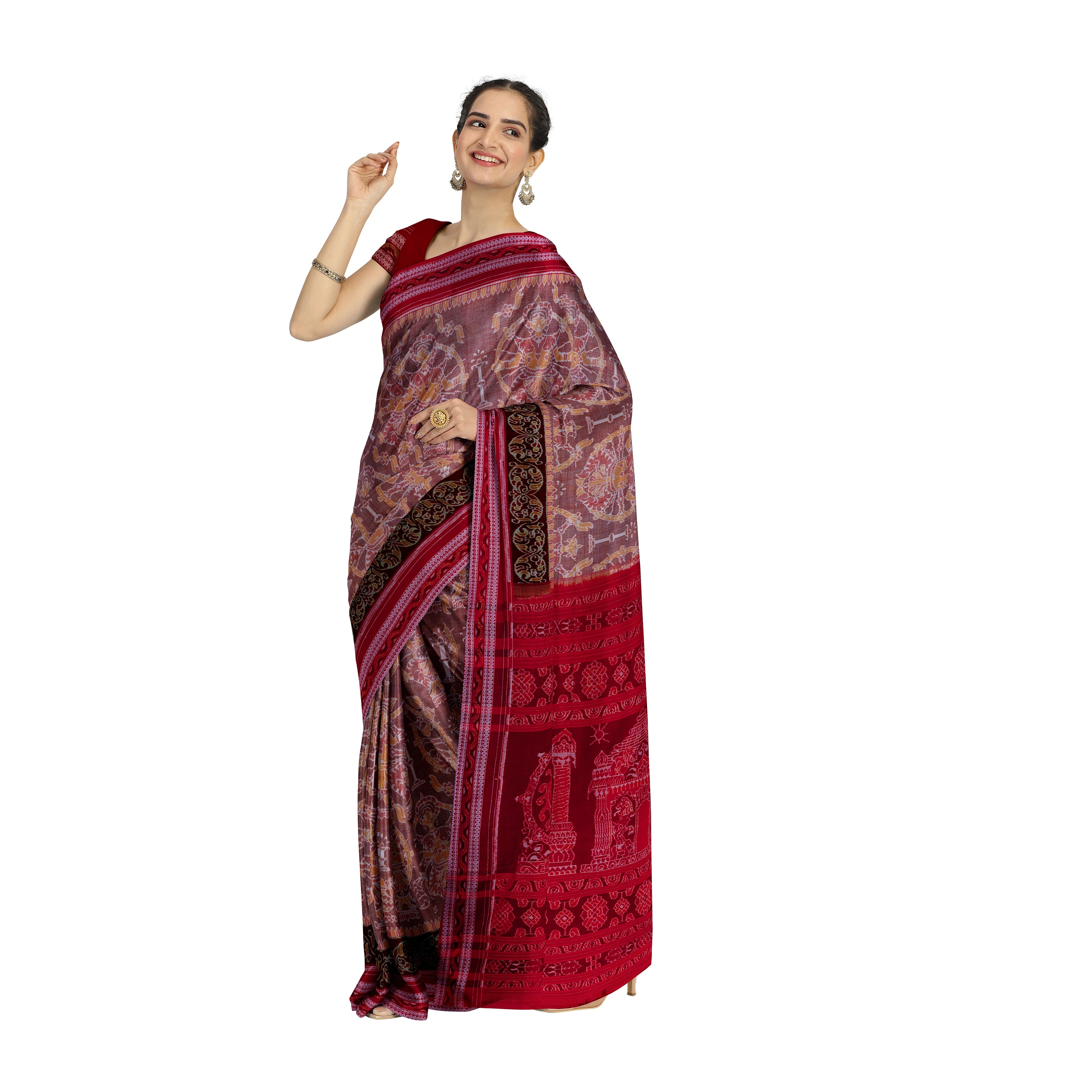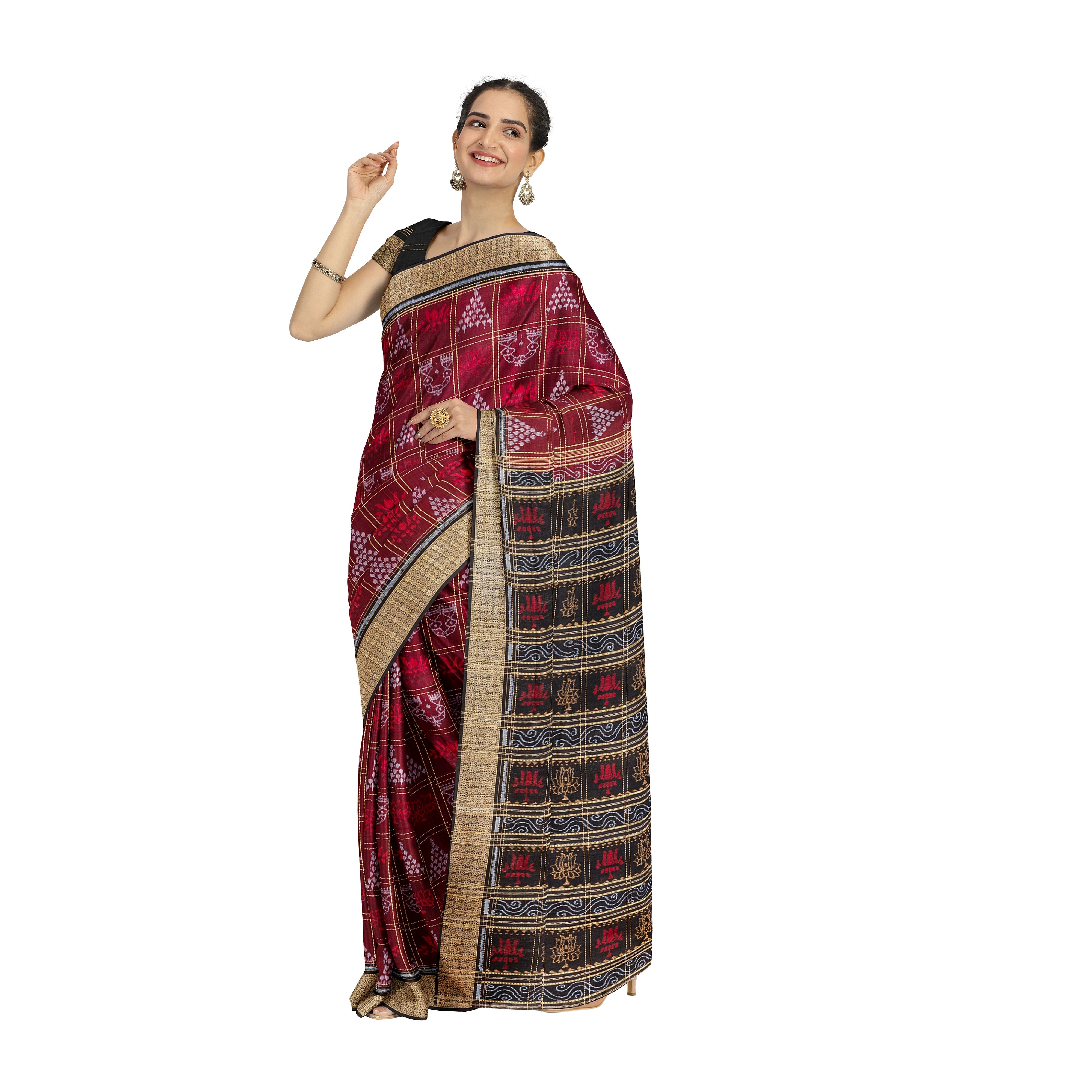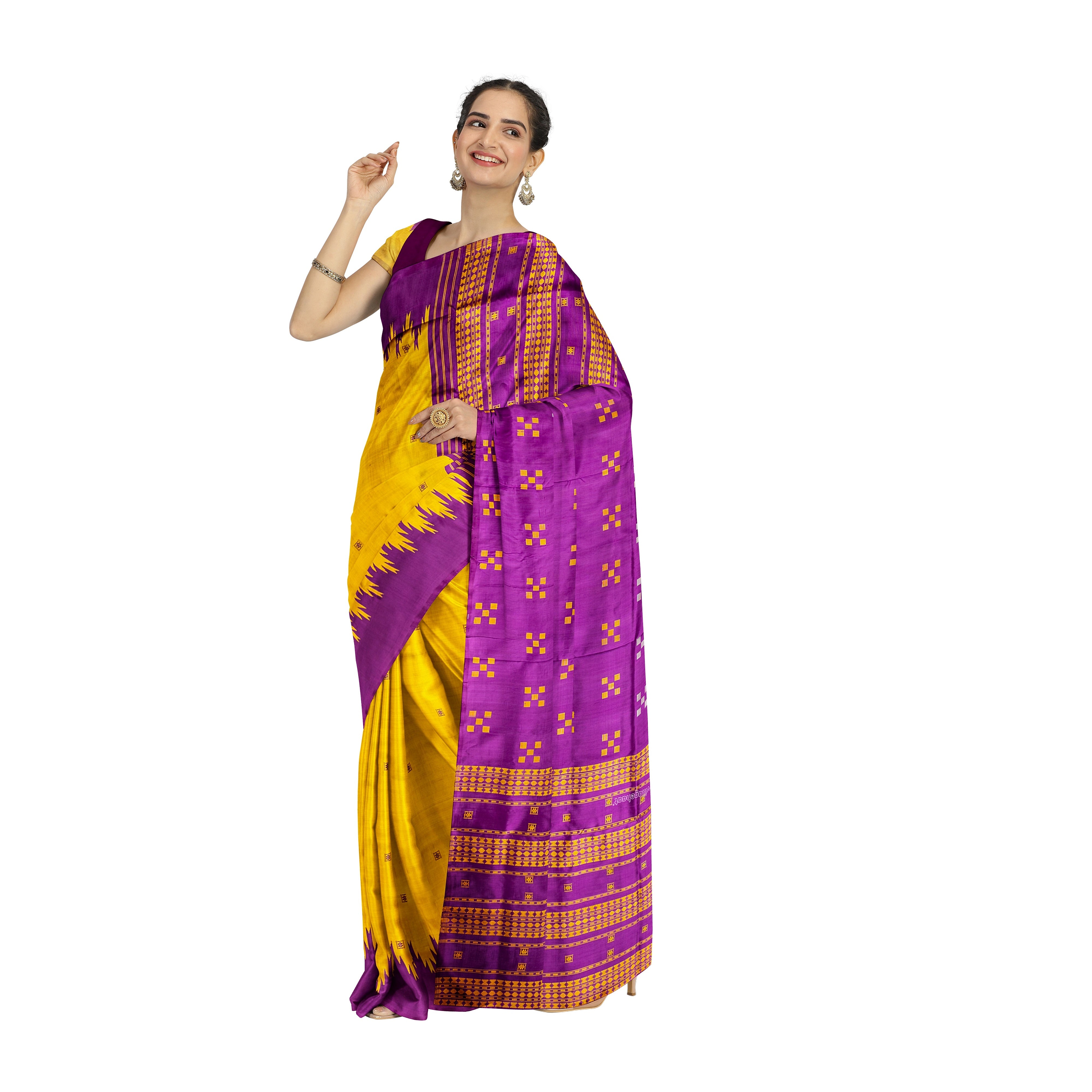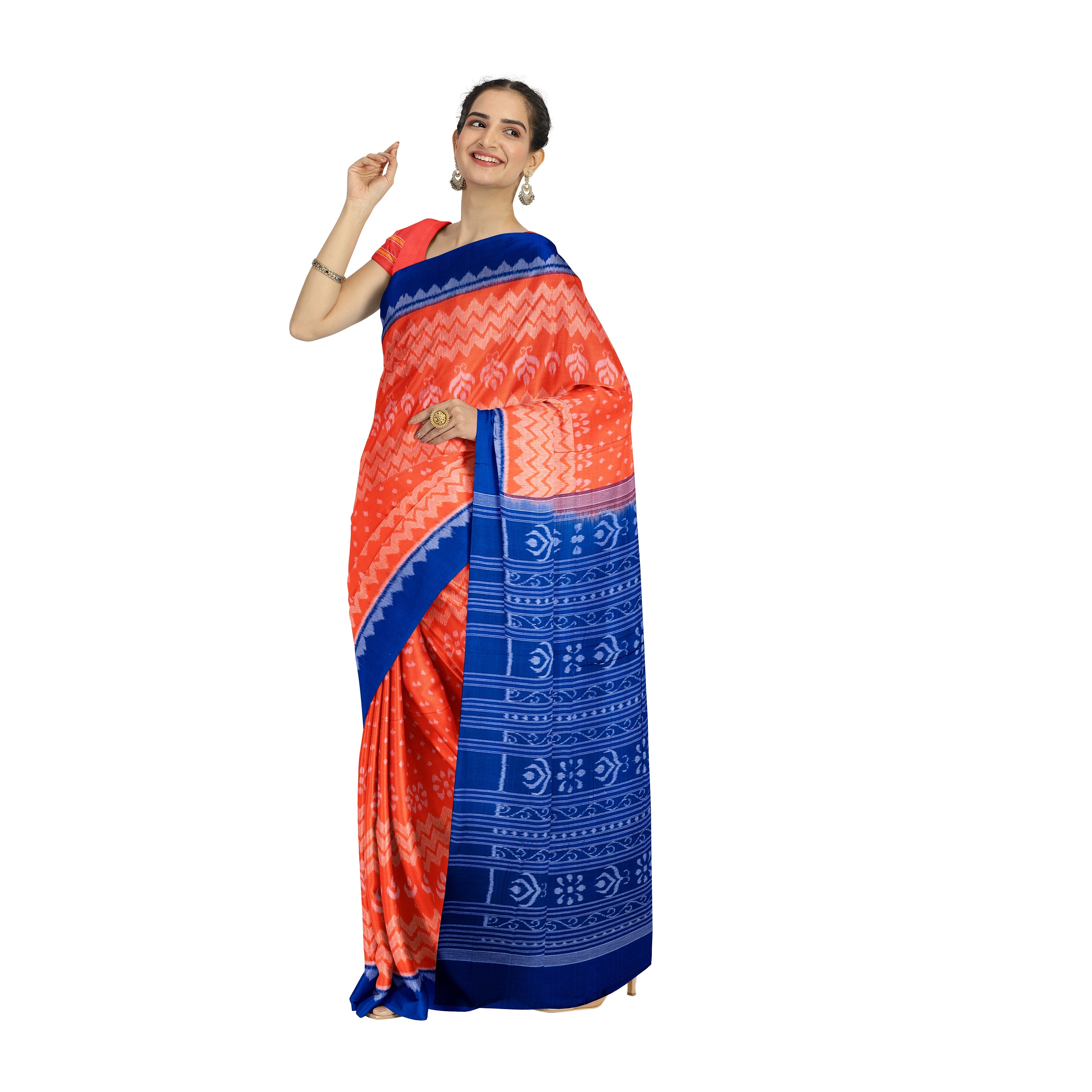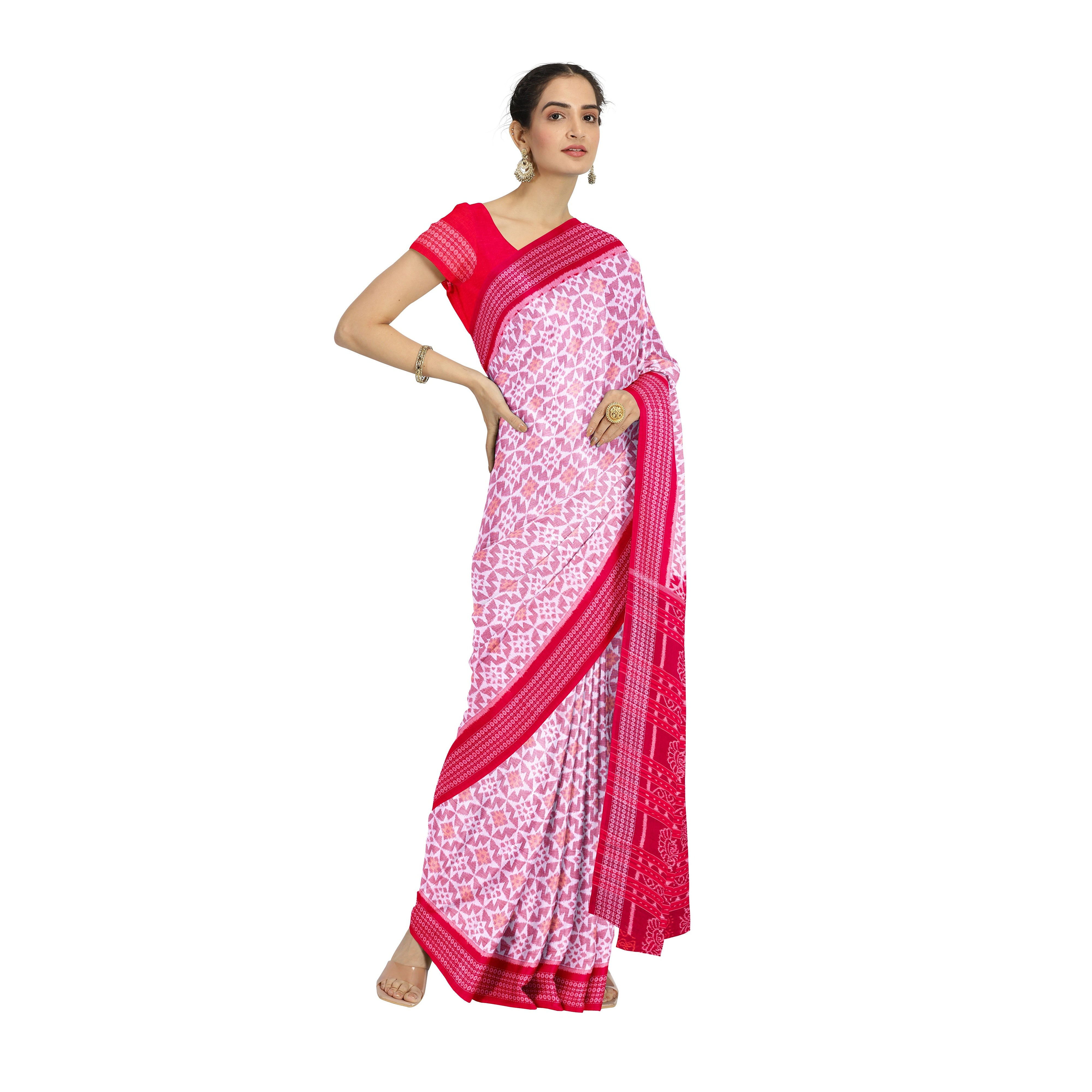 Discover the charm of this Bapta saree, crafted from a comfortable and elegant raw silk and cotton mix. The saree showcases a vibrant red buta design that dances across the fabric, while the pallu and body are further enhanced by classic Sambalpuri traditional motifs. This ensemble is finished with a simple yet sophisticated plain red blouse piece.