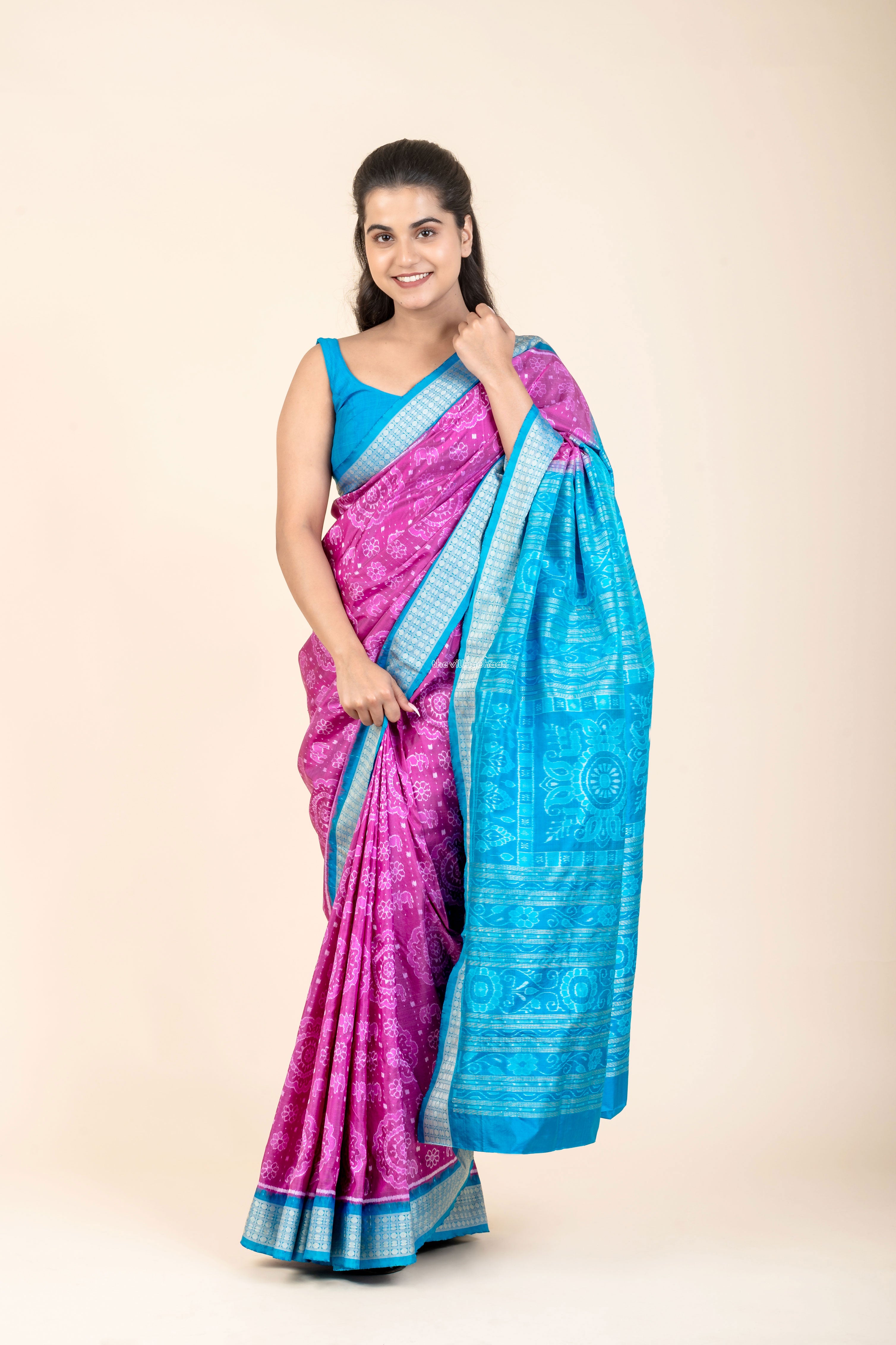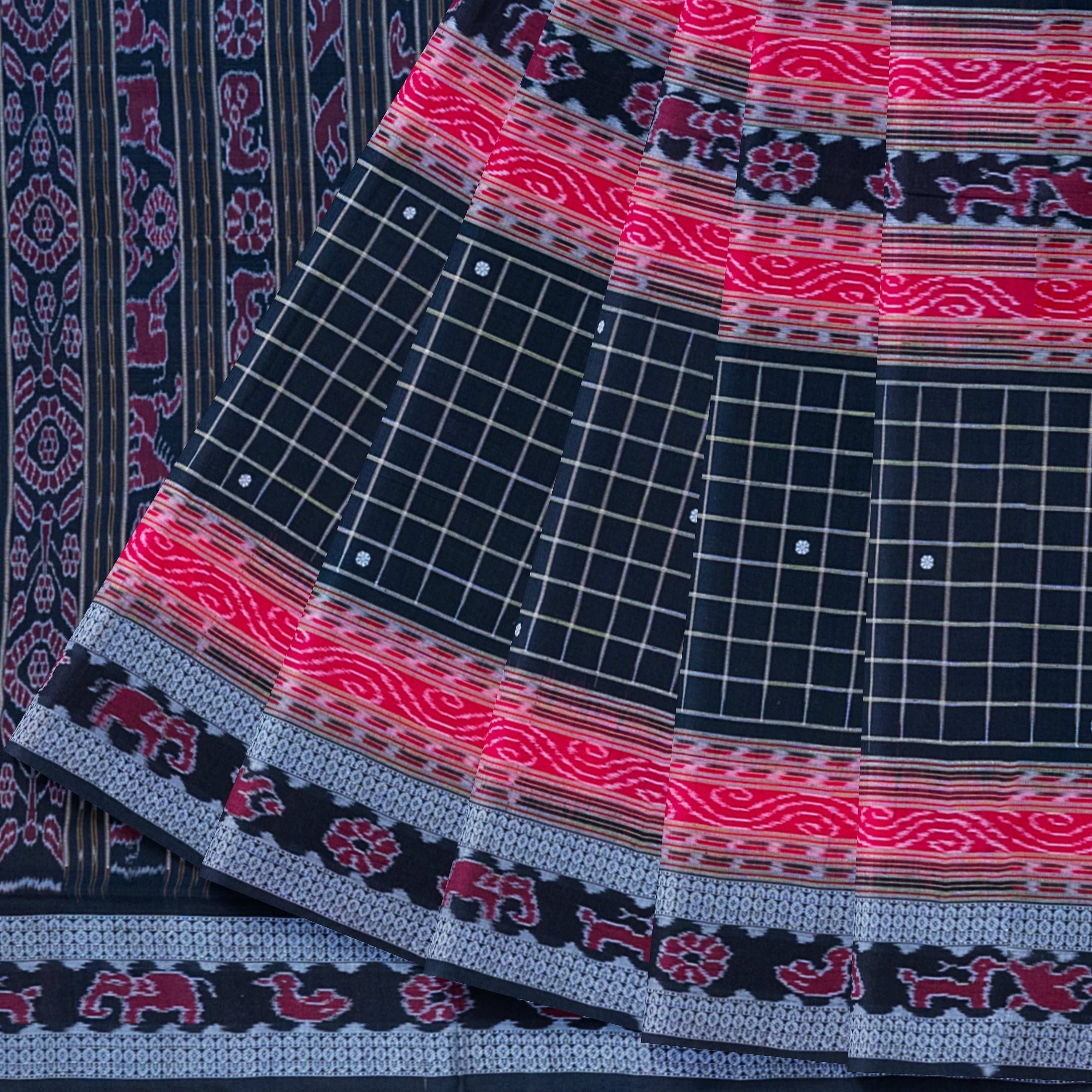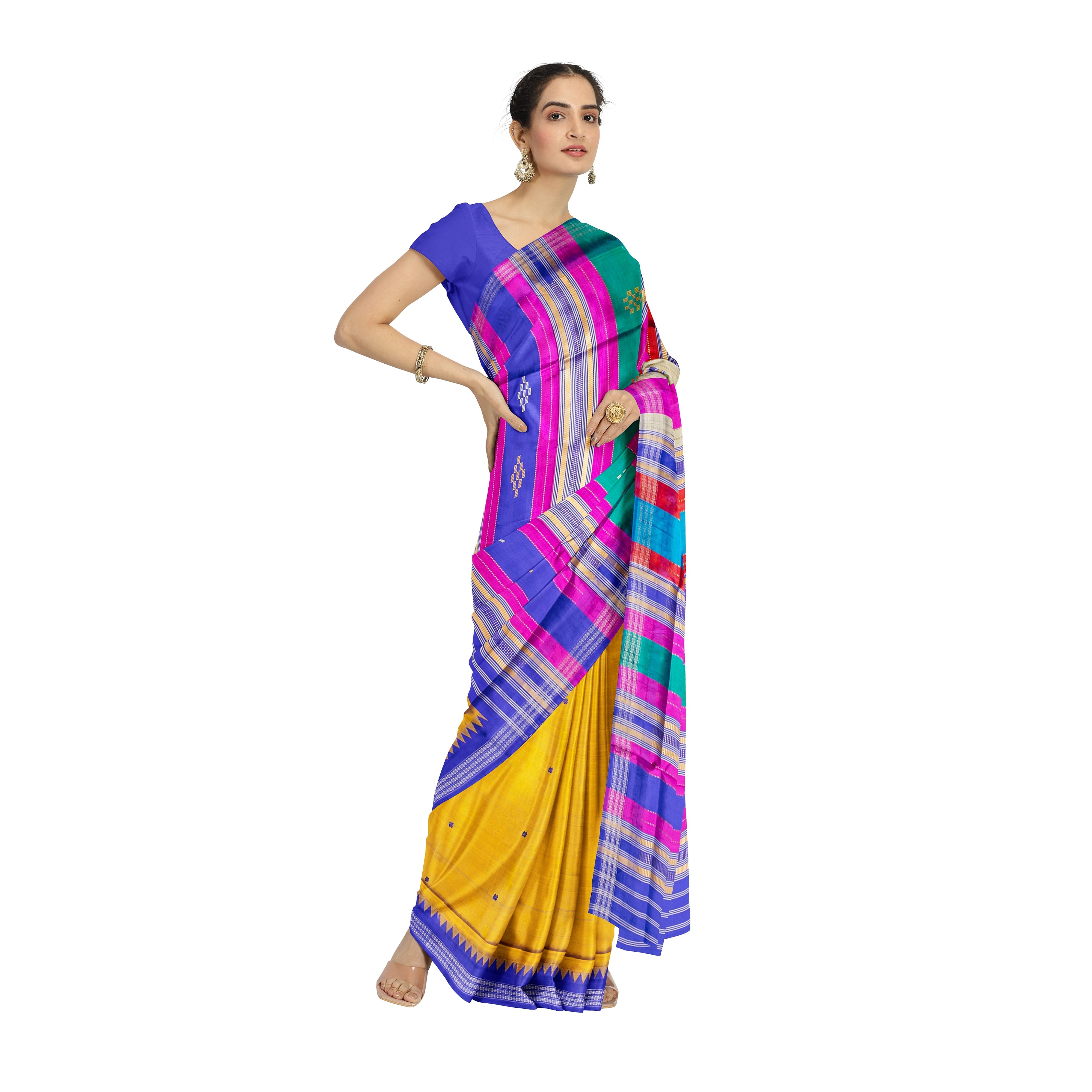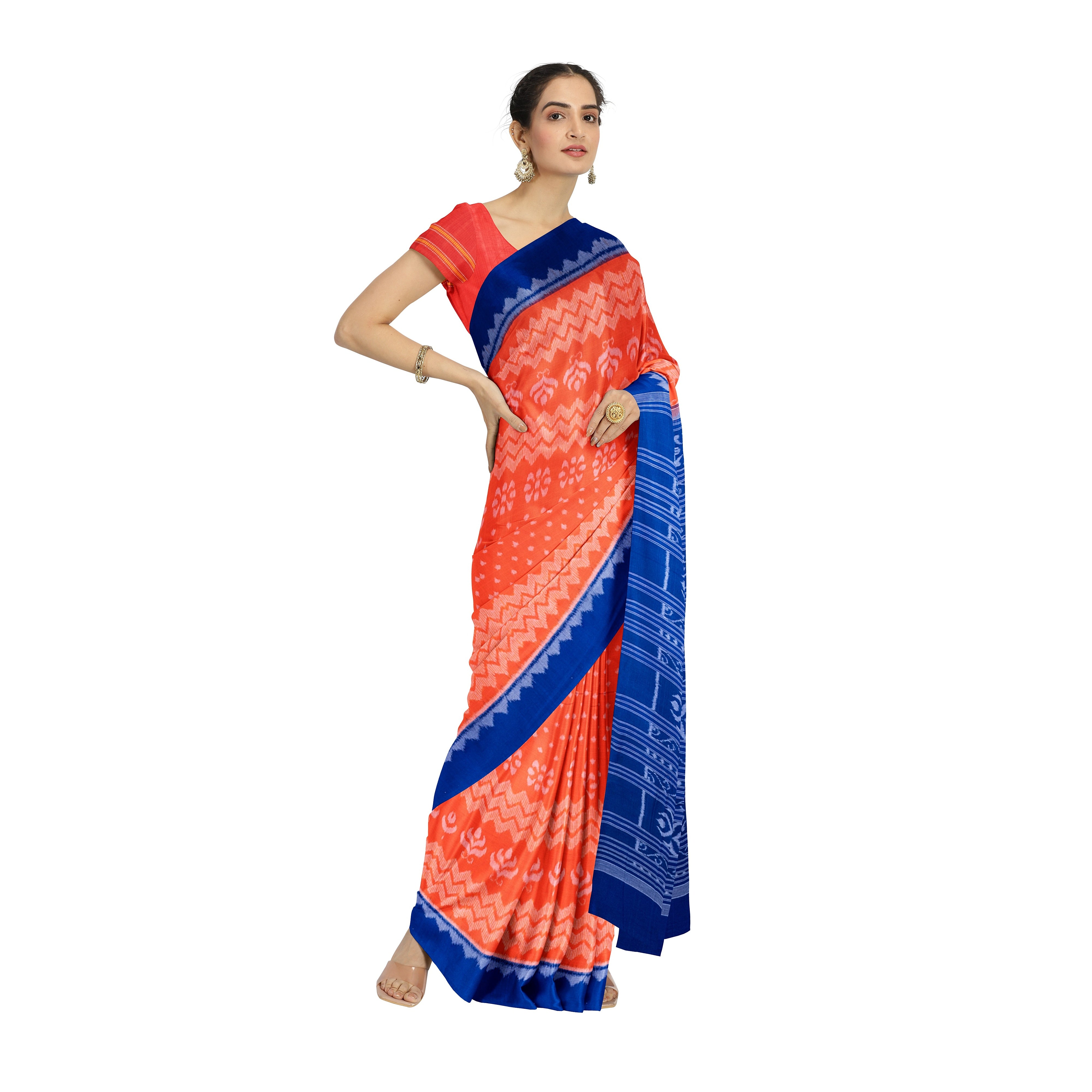 Discover the charm of this Bapta saree, crafted from a comfortable and elegant raw silk and cotton mix. The saree showcases a vibrant red buta design that dances across the fabric, while the pallu and body are further enhanced by classic Sambalpuri traditional motifs. This ensemble is finished with a simple yet sophisticated plain red blouse piece.